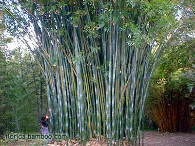 A new introduction to Florida that is much in demand. Blue Bamboo is similar in overall appearance to Royal Bamboo, except that the powdery whitish coating on the canes is even more pronounced, giving them a decidedly blueish whitish tinge. Grows to about 40 feet. The canes are very upright, with very little outward arching, so they give the plant a regal columnar appearance. Cold-hardy to around 20 degrees.