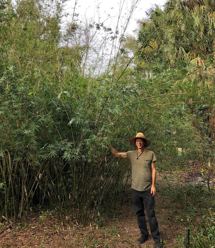 Rare and highly sought-after, due to its magnificent appearance and cold tolerance. I helped popularize this outstanding variety when I got the American Bamboo Society to recognize it as the distinct cultivar Bambusa textilis ‘Kanapaha’. You can see plantings of Royal Bamboo (supplied by me in the early 2000s) in the landscaping in front of the Harn Art Museum in Gainesville. With good care, Royal Bamboo can be sending up full-sized, fifty-foot canes just three to four years after planting.