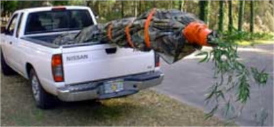 The Royal and Blue bamboo plants I have this year were dug from mature stands in the ground over winter and put into pots, so they have much taller canes, which were trimmed but are still 8 to 15 feet tall. A pickup truck works well for transporting these larger bamboo plants. Smaller vehicles may require trimming the canes back considerably for transport. For transporting the larger plants in a pickup truck or trailer, bring sheets or plastic garbage bags for wrapping, duct tape or rope for securing the wraps, and a red flag (T shirt, scrap of red cloth, flagging tape, etc) to attach to the end.